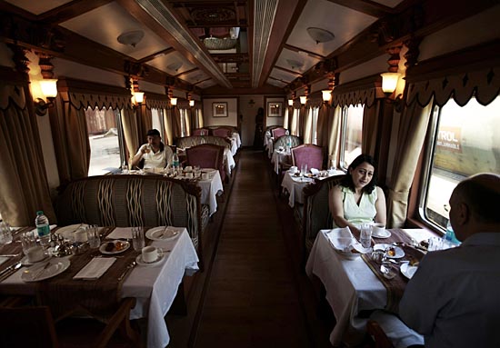 旅客在印度哈桑站停車的“金色戰(zhàn)車”號豪華列車的餐車里吃飯(攝于4月10日)。“金色戰(zhàn)車”號是卡納塔克邦旅游發(fā)展公司為了促進旅游業(yè)和鐵路部門聯(lián)合開發(fā)的高檔豪華列車。為了吸引商業(yè)旅行的客戶,“金色戰(zhàn)車”號上配有會議室和無線網(wǎng)絡服務。新華社/法新