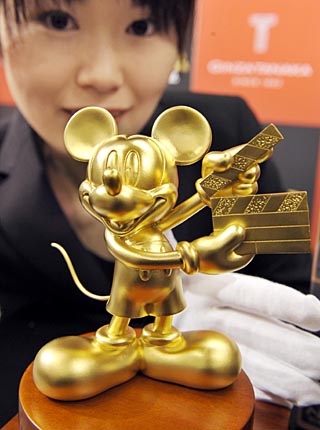 23日,在日本首都東京舉行的迪斯尼公司電影《國家寶藏2》DVD的推廣活動(dòng)上,工作人員展示一只純金米老鼠。這只米老鼠高12厘米,重一公斤,價(jià)值約3.2萬美元,將在迪斯尼公司DVD推廣活動(dòng)上作為獎(jiǎng)品發(fā)放。新華社/法新