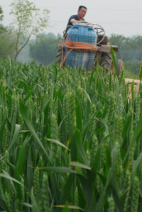 河北滄州市獻(xiàn)縣單橋村一名農(nóng)民在麥田里為小麥噴施營養(yǎng)液。