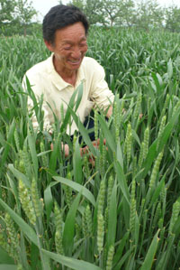 河北滄州市獻(xiàn)縣單橋村一名農(nóng)民在麥田里觀察抽穗的小麥。