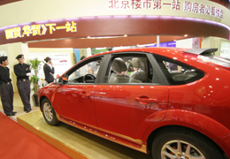 5月15日,在北京春季房展會展廳,一家參展房地產(chǎn)公司展示“買房送車”的車型。當日,2008年北京春季房展會在北京國貿(mào)中心開幕,共有100多個房產(chǎn)項目參展。