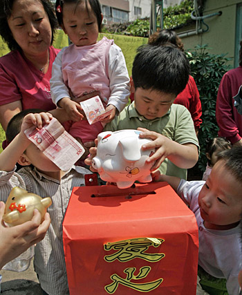 5月15日,天津和平區(qū)保育院的兒童帶著自己的存錢罐,向四川地震災(zāi)區(qū)捐獻自己的“積蓄”。