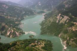 唐家山一帶受阻河道水面上升較快。由于水量過大,一旦堤壩坍塌會對下游構(gòu)成極大威脅。新華社記者:王建民 攝