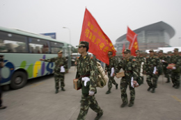 5月25日,武警水電部隊官兵在綿陽機場的營地,準備上車駛往唐家山堰塞湖方向。新華社記者:朱煒 攝