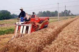 5月26日,安徽蕪湖縣合心村竹元拐農(nóng)機(jī)作業(yè)合作社成員駕著收割機(jī)為農(nóng)民收割小麥。 夏收夏種季節(jié),安徽蕪湖縣合心村竹元拐農(nóng)機(jī)作業(yè)合作社組成助耕服務(wù)隊(duì),每天出動近20臺拖拉機(jī)、收割機(jī)和插秧機(jī),為農(nóng)民開展機(jī)收小麥、機(jī)耕打田和機(jī)插秧訂單服務(wù),以減輕農(nóng)民勞動強(qiáng)度,提高夏收夏種進(jìn)度。