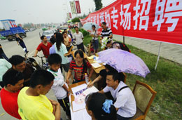 5月27日,四川省綿竹市勞動(dòng)和社會(huì)保障局在受災(zāi)群眾居住點(diǎn)舉辦“情系災(zāi)區(qū)”就業(yè)援助專場(chǎng)招聘會(huì)。成都、德陽(yáng)和來(lái)自廣東、甘肅等地的10多家企業(yè)為受災(zāi)群眾提供了1100個(gè)就業(yè)崗位。有關(guān)方面希望更多的企業(yè)能夠到災(zāi)區(qū)招聘,為受災(zāi)群眾提供更多的就業(yè)崗位。