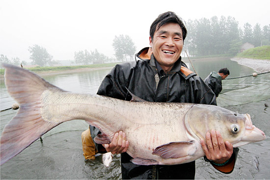5月26日,江蘇省贛榆縣歡墩鎮(zhèn)養(yǎng)殖戶(hù)孟憲濤在自家養(yǎng)殖魚(yú)塘內(nèi)打撈起一條重達(dá)27.5公斤的鰱魚(yú)。 近年來(lái),贛榆縣采取一系列優(yōu)惠措施,鼓勵(lì)引導(dǎo)農(nóng)民發(fā)展無(wú)公害淡水魚(yú)養(yǎng)殖,全縣淡水魚(yú)養(yǎng)殖面積已達(dá)20余萬(wàn)畝。 | |