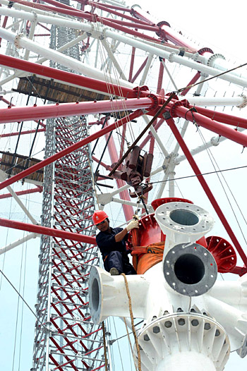 5月27日,福建省第二電力建設(shè)公司的建設(shè)者在128.5米高的海上500千伏輸電線路鐵塔上作業(yè)。