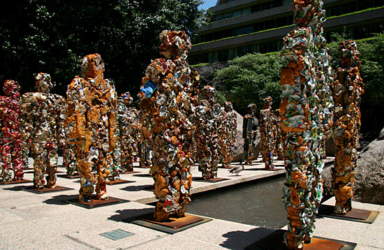 | 2日,在美國(guó)首都華盛頓,由德國(guó)雕塑家舒爾特創(chuàng)作的“垃圾人”在美國(guó)國(guó)家地理學(xué)會(huì)的院子里展出。創(chuàng)作這些“垃圾人”的原材料是在德國(guó)城市科隆的市政垃圾處理場(chǎng)里收集來(lái)的。舒爾特進(jìn)行此次創(chuàng)作的目的是促使人們提高環(huán)保意識(shí)。新華社/法新 | |