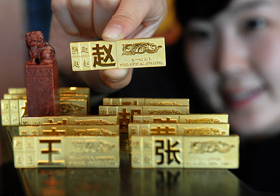 當日,由中國國家博物館藝術(shù)品開發(fā)中心監(jiān)制的“中國姓氏金條”亮相北京。新華社發(fā)