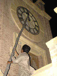 日前,巴基斯坦全國調整時間,將時鐘撥快一小時,商店也提早關門。政府采取這一舉措,是為了節(jié)約用電,以應對嚴重的電力短缺。圖為在巴基斯坦的海得拉巴,一名男子用竹竿調整鐘樓上時鐘的指針。