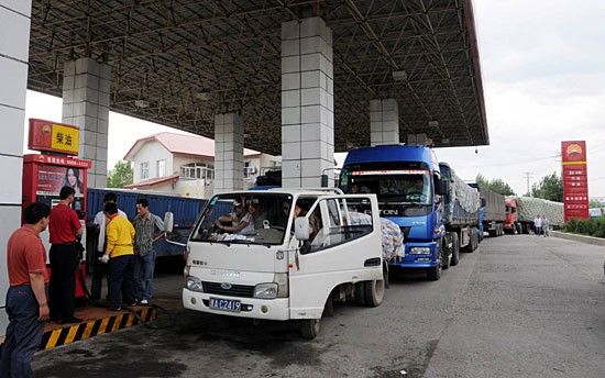 6月11日,在哈爾濱學(xué)府路上的一處加油站,加柴油的車輛排出了“長龍”。當(dāng)日,記者走訪哈爾濱一些加油站發(fā)現(xiàn),部分加油站0#柴油斷貨,一些能加柴油的加油站提高了油價(jià),并實(shí)行限量銷售。在學(xué)府路上的中國石油哈爾濱銷售分公司哈京加油站,加柴油的車輛排起了長隊(duì),一些車輛為加柴油要等上近兩個(gè)小時(shí)。