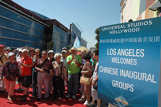 23日,中國公民赴美旅游首發(fā)團(tuán)中來自北京的游客在導(dǎo)游帶領(lǐng)下等待參觀美國洛杉磯環(huán)球影城主題公園。當(dāng)日,中國公民赴美旅游首發(fā)團(tuán)的240多名游客和旅游部門官員在結(jié)束美國東部的行程后抵達(dá)洛杉磯參觀游覽。