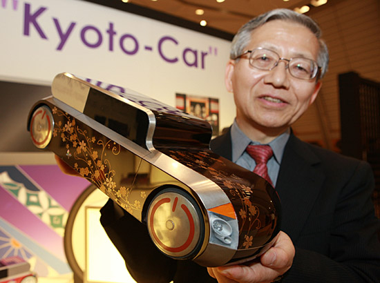 25日,在日本京都即將舉行八國集團外長會議的會場內(nèi),京都大學(xué)副校長松重和美教授展示其牽頭研發(fā)的“京都電動概念車”模型。松重和美教授攜該模型來到會場,旨在呼吁八國集團加大在電動車領(lǐng)域的研發(fā)力度,以減少溫室氣體排放。為期2天的八國集團外長會議將于6月26日至27日在京都舉行。新華社記者 任正來 攝