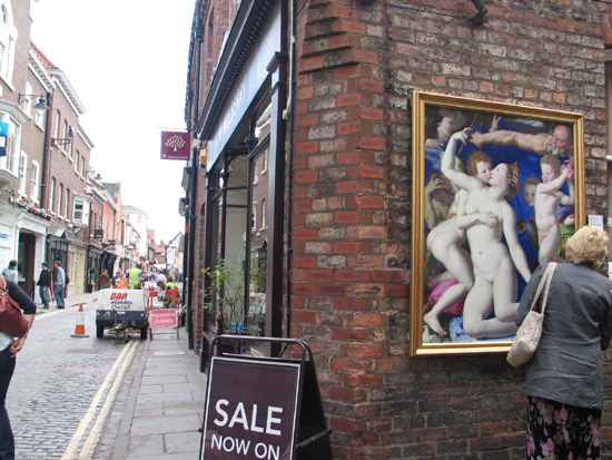 2日,在英國中部的歷史古城約克,一名婦女在欣賞掛在街頭墻壁上的一幅世界名畫。近日,以藝術(shù)收藏聞名的英國國家美術(shù)館與約克藝術(shù)館合作推出了為期三個多月的“教育旅行”活動,精選49幅世界著名畫家的作品,擺放在約克市中心,讓世界名作走出畫廊,來到民間,融入大眾生活。