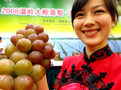7月21日,一位工作人員正在展示巨峰葡萄。 當(dāng)日,2008溫嶺大棚葡萄·梨推介會(huì)在杭州舉行。據(jù)了解,2007年,浙江溫嶺市通過(guò)當(dāng)?shù)剞r(nóng)民專業(yè)合作社累計(jì)銷售農(nóng)產(chǎn)品62萬(wàn)噸,銷售金額10.2億元,向社員返還盈余1.8億元。 |