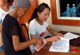 7月22日,四川省什邡市師古鎮(zhèn)雙安村87歲的高克群老人(左)領(lǐng)到2000元自建過渡房補(bǔ)助資金。汶川大地震后,重災(zāi)區(qū)四川省什邡市許多農(nóng)村受災(zāi)群眾自建起了過渡房。近日,按照相關(guān)政策,當(dāng)?shù)剞r(nóng)村受災(zāi)群眾開始領(lǐng)取自建房補(bǔ)助資金。 |