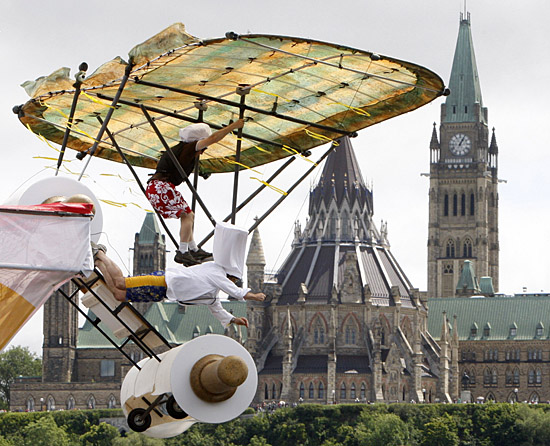 3日,在加拿大魁北克的加蒂諾,兩名“飛行員”駕駛自制的“飛機(jī)”參加比賽。但他們?cè)囷w不久,便因“飛機(jī)”失控而跳向渥太華河。新華社/路透