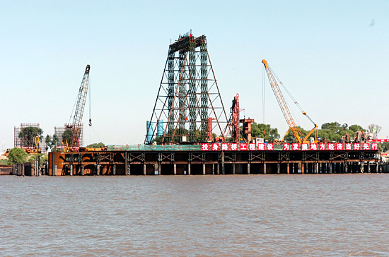 這是8月3日拍攝的正在施工的哈爾濱松浦大橋主塔鉆孔平臺(tái)。