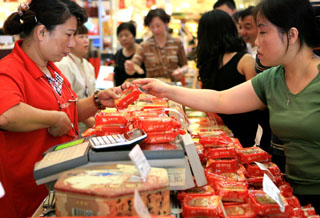 8月26日,顧客在上海第一食品商店內(nèi)選購(gòu)簡(jiǎn)裝月餅。