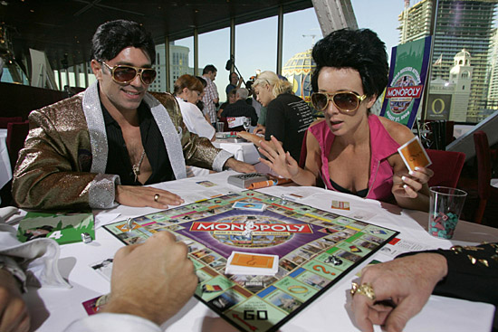 27日,在美國內(nèi)華達州的拉斯維加斯,幾名玩家裝扮成明星模樣玩起“大富翁”游戲。27日格林威治標準時間14點,在倫敦、馬德里、東京、東朗梅多等20多個城市,玩家們同時展開“大富翁”游戲活動,力爭創(chuàng)下最多人同時進行“大富翁”游戲的吉尼斯世界紀錄。新華社/路透