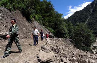 9月3日,武警交通四支隊(duì)干部帶領(lǐng)群眾步行穿過(guò)排龍溝塌方段。