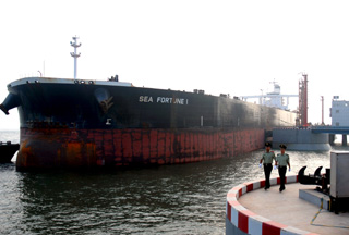 河北省唐山港曹妃甸中石化石油碼頭日前開航。曹妃甸中石化30萬(wàn)噸級(jí)石油碼頭自2006年11月開工建設(shè),2008年7月竣工。碼頭最大可靠泊45萬(wàn)噸級(jí)油輪,接卸原油能力最大可達(dá)每小時(shí)1.2萬(wàn)立方米。圖為河北邊防干警在曹妃甸原油碼頭巡邏。