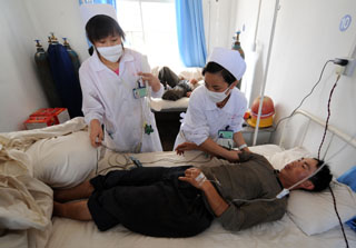 9月18日,尋甸縣人民醫(yī)院護(hù)士為中毒人員測(cè)量心率。