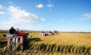 在黑龍江省八五六農(nóng)場,工人們在駕駛收割機收割水稻。