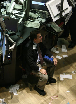 10月6日,一名交易員在美國(guó)紐約證券交易所工作時(shí)小憩。當(dāng)日,因?qū)π刨J緊縮和全球經(jīng)濟(jì)放緩的恐慌情緒蔓延,紐約股市三大指數(shù)跌幅全部超過(guò)3%,其中道瓊斯指數(shù)收于9955.50點(diǎn),4年來(lái)首度跌破10000點(diǎn)關(guān)口。
