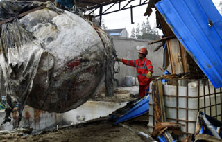 10月7日中午,上海奉賢區(qū)金匯鎮(zhèn)發(fā)生一起廢棄三氯化磷儲罐泄漏事故,造成周邊一些群眾氯化氫中毒。目前,污染源已徹底清除,空氣質(zhì)量達標(biāo),無危重病人,部分受傷群眾已康復(fù)出院。圖為10月8日,環(huán)保人員對發(fā)生泄漏的儲罐進行調(diào)離處置。