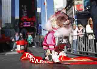 19日,在美國(guó)紐約時(shí)報(bào)廣場(chǎng)舉行的犬類化妝大賽上,奇瓦瓦狗“花生”憑借百老匯音樂(lè)劇《律政俏佳人》的主角艾兒·伍茲的裝束獲得本屆化妝大賽冠軍。