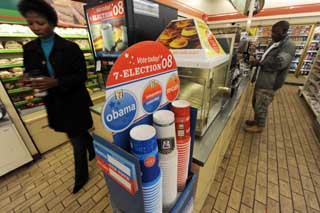 20日,在美國首都華盛頓國會山,印有美國民主黨總統(tǒng)候選人奧巴馬和共和黨總統(tǒng)候選人麥凱恩名字的一次性紙杯被擺放在一家7-11便利店里。顧客可以根據(jù)自己的傾向選擇其一盛取咖啡。當(dāng)天,印有奧巴馬名字的紙杯在這場全國范圍內(nèi)舉行的“咖啡杯競賽”中以60%的“支持率”居領(lǐng)先地位。