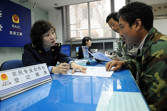 | 10月22日,北京西城工商局德勝工商所工作人員在新近開(kāi)設(shè)的農(nóng)民專業(yè)合作社登記服務(wù)臺(tái)前為農(nóng)民工提供咨詢服務(wù)。北京工商部門積極開(kāi)展農(nóng)民專業(yè)合作社的登記發(fā)展工作,大力培育和發(fā)展農(nóng)村經(jīng)紀(jì)人,為切實(shí)搞活農(nóng)產(chǎn)品流通,推進(jìn)農(nóng)村發(fā)展做好服務(wù)工作。 | |
