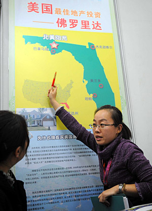 10月30日,一名工作人員在向購(gòu)房者介紹位于美國(guó)佛羅里達(dá)的房產(chǎn)項(xiàng)目。 當(dāng)日,2008北京秋季房地產(chǎn)展示交易會(huì)在中國(guó)國(guó)際貿(mào)易中心開幕。此次房展匯集了北京、外埠近百個(gè)地產(chǎn)項(xiàng)目,來自澳洲和美國(guó)的國(guó)外地產(chǎn)項(xiàng)目也參加了展會(huì)。 | |