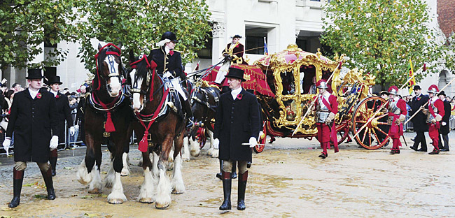 8日,在英國首都倫敦,新當(dāng)選的金融城市長的金馬車在巡游。當(dāng)天,一年一度的金融城市長就職巡游在倫敦舉行。倫敦金融城的“市長就職巡游”有800多年的歷史,最早是倫敦民選市長就職后從倫敦城巡游到威斯敏斯特向君主宣誓效忠的一項(xiàng)活動(dòng),后來演變成倫敦市民的年度狂歡盛會(huì)。