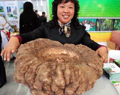 首屆中國(guó)生態(tài)文化博覽會(huì)當(dāng)日在云南昆明國(guó)際會(huì)展中心開(kāi)幕,集中展示了各地豐富多樣的自然生態(tài)產(chǎn)品,其中富有特色的無(wú)公害、綠色瓜果蔬菜受到觀眾的一致青睞。一名女士在昆明國(guó)際會(huì)展中心展示重達(dá)27公斤的大魔芋。