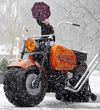 24日,來(lái)自美國(guó)的格雷戈里·鄧納姆在德國(guó)埃森汽車展媒體日上展示他的巨型摩托車。這輛摩托車長(zhǎng)達(dá)6.20米,重為500磅(約合227公斤),已被載入吉尼斯世界紀(jì)錄。新華社/法新