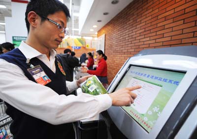 11月30日,超市工作人員在操作蔬菜質(zhì)量追溯系統(tǒng)。 近日,哈爾濱市在沃爾瑪超市啟動(dòng)蔬菜質(zhì)量安全監(jiān)管追溯系統(tǒng),蔬菜進(jìn)入超市有了“身份證”。消費(fèi)者、執(zhí)法部門通過掃描農(nóng)產(chǎn)品上或產(chǎn)品包裝箱上粘貼的帶有追溯碼的標(biāo)識(shí),或直接將追溯碼輸入超市的蔬菜質(zhì)量追溯系統(tǒng),就可以追溯到認(rèn)證主體,查詢產(chǎn)品生產(chǎn)、質(zhì)量等相關(guān)信息。 |