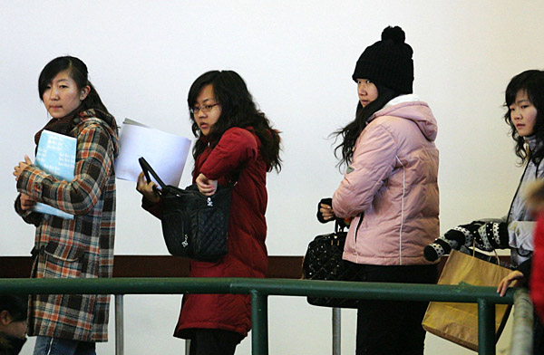 幾位女大學(xué)生手捧簡(jiǎn)歷排隊(duì)等候入場(chǎng)。