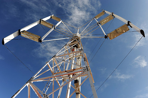 這是建在日月山頂?shù)拇怪陛S風(fēng)力發(fā)電機(jī)(12月26日攝)。 我國海拔最高的風(fēng)力發(fā)電試驗(yàn)場近日在海拔3500多米的青海湖畔日月山地區(qū)建成,試驗(yàn)場由3臺(tái)功率為300千瓦的垂直軸風(fēng)力發(fā)電系統(tǒng)組成,年發(fā)電量可達(dá)320萬千瓦時(shí)。根據(jù)有關(guān)規(guī)劃,風(fēng)力資源豐富的青海日月山地區(qū)可建成2000臺(tái)風(fēng)力發(fā)電機(jī)組成的大型風(fēng)力發(fā)電場。 | |