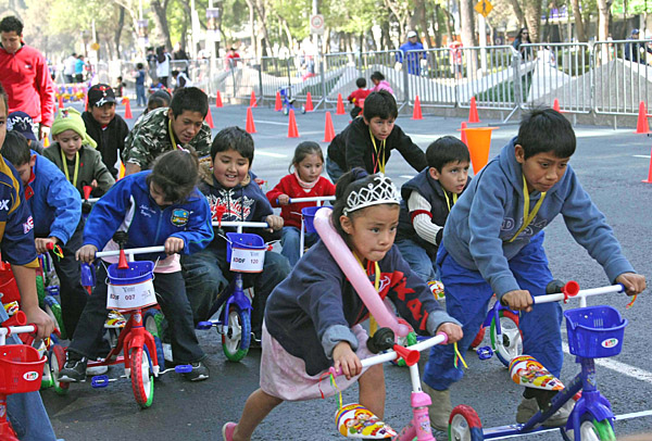 28日,在墨西哥首都墨西哥城的改革大道上,孩子們參加騎小三輪車比賽。組織者希望通過(guò)這次活動(dòng)豐富孩子們節(jié)假日的生活。