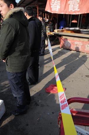 1月7日,河北三河市燕郊行宮活禽市場活禽交易區(qū)域已全部關(guān)閉,市場保安人員在現(xiàn)場警戒線前守護。 當日,河北省三河市關(guān)閉燕郊地區(qū)所有活禽交易市場,并對外部環(huán)境進行采樣和徹底消毒。1月6日,北京市發(fā)生一例人感染高致病性禽流感死亡病例。據(jù)悉,死者生前曾接觸過從河北省三河市燕郊行宮市場購買的活殺鴨肉。目前,三河市尚未發(fā)現(xiàn)禽流感疫情,疫情搜索和各項防控工作正在進行中。