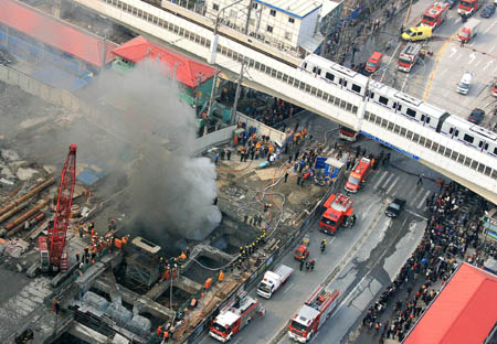 1月8日,一列地鐵列車正從火災(zāi)現(xiàn)場附近駛過。 當(dāng)日11時30分左右,上海軌道交通11號線曹楊路工地位于地下20余米處發(fā)生火災(zāi),現(xiàn)場濃煙滾滾。到中午12時30分許,消防部門已經(jīng)從地下救出3名工人,并基本控制火勢。目前已發(fā)現(xiàn)1人死亡。經(jīng)初步確認(rèn),火災(zāi)是由乙炔爆燃引起的。目前,安監(jiān)、消防等部門正在調(diào)查這起事故的具體原因。