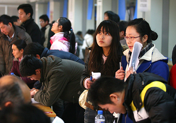 日前,由鄭州市政府和河南省勞動和社會保障廳舉辦的2009年首場招聘會與“春季就業(yè)援助行動”在鄭州市大學路舉行。圖為大學生在招聘會上觀看招聘信息。新華社發(fā)