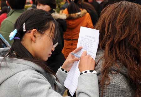 1月13日,一名畢業(yè)生在同學(xué)的背上填寫求職申請表。 當(dāng)日,在位于昆明市的云南師范大學(xué)龍泉校區(qū),舉辦了一場主要面向師范類高校畢業(yè)生的大型就業(yè)洽談會,共有200多家單位現(xiàn)場招賢,提供就業(yè)崗位數(shù)千個,吸引昆明及其周邊眾多畢業(yè)生前來求職。2009年云南省的高校畢業(yè)生人數(shù)超過10萬人,再創(chuàng)歷史新高。日前,云南省政府決定從2009年起每年安排1億元創(chuàng)業(yè)資金,用于支持大學(xué)畢業(yè)生和農(nóng)民工等自主創(chuàng)業(yè)。 |