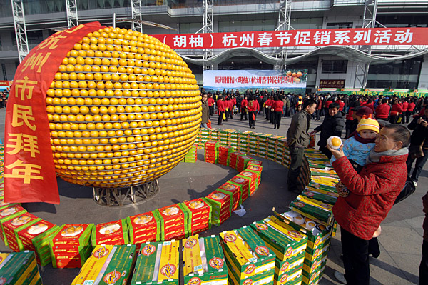 1月14日,浙江衢州柑橘(胡柚)杭州春節(jié)促銷活動在杭州舉行。面對嚴峻的銷售形勢,衢州市委、市政府專門出臺政策,采取開拓市場、開辟綠色通道、單位幫扶、信貸保障等多方面舉措,幫助橘農(nóng)解決“賣橘難”問題。