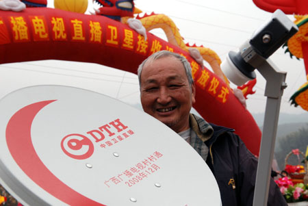 1月21日,廣西昭平鎮(zhèn)橫江屯農(nóng)民在發(fā)放儀式上領(lǐng)取廣播電視直播衛(wèi)星接收設(shè)備。 當(dāng)日,廣西昭平縣在大山深處的昭平鎮(zhèn)橫江屯舉辦“村村通廣播電視直播衛(wèi)星接收設(shè)備”發(fā)放儀式,該屯37戶農(nóng)民都領(lǐng)到了一套衛(wèi)星接收設(shè)備。在技術(shù)人員的指導(dǎo)下,該屯農(nóng)民當(dāng)天就能收看(收聽)到54套衛(wèi)星電視節(jié)目、48套立體聲廣播節(jié)目。春節(jié)前夕,昭平縣共有263個廣播電視“盲點村”的2萬多名農(nóng)民結(jié)束了收聽、收看廣播電視難的歷史。 |
