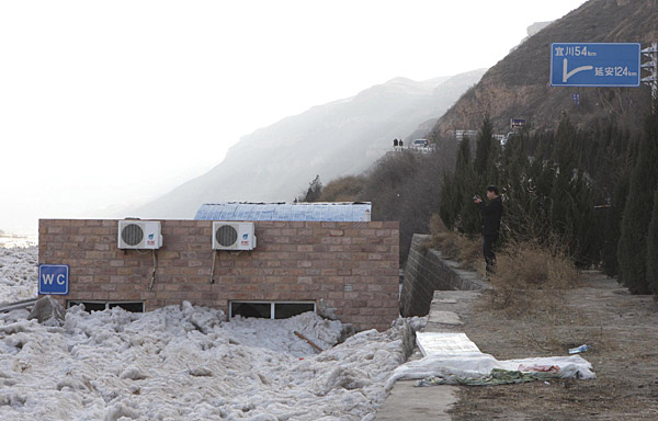 1月21日,攝影師在陜西宜川壺口瀑布主景區(qū)一公廁旁拍攝凌汛災(zāi)害情況。 1月17日23時(shí)20分至18日零時(shí)48分,黃河突發(fā)特大凌汛,洪水夾雜大量冰塊涌進(jìn)陜西宜川黃河壺口主景區(qū),短時(shí)間內(nèi)冰凌布滿400多米寬的河道,堆積厚度高達(dá)數(shù)十米。據(jù)景區(qū)管理局局長(zhǎng)程小衛(wèi)介紹,這次凌汛為百年不遇,初步統(tǒng)計(jì)景區(qū)直接經(jīng)濟(jì)損失上千萬(wàn)元。 | |
