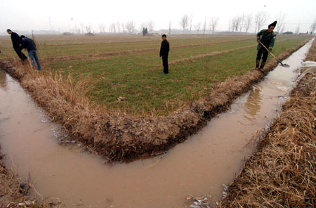 2月4日,陜西省蒲城縣洛惠渠陳莊管理站專業(yè)澆地隊(duì)員馬春成(右一)正在田間實(shí)施灌溉。 面對(duì)日趨嚴(yán)重的旱情,陜西渭南要求全市各灌區(qū)動(dòng)用一切水利設(shè)施,挖掘水源潛力,擴(kuò)大灌溉面積。渭南市是陜西小麥主產(chǎn)區(qū)之一,目前已經(jīng)形成百日連旱,全市各類農(nóng)作物受旱面積達(dá)到380萬(wàn)畝,其中重旱災(zāi)20萬(wàn)畝。